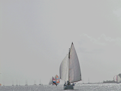 Lors d'une navigation assez musclée, une vague est malicieusement, passée par dessus le bateau. L'eau est rentrée dans le carré et l'ordinateur a pris l'eau. Il faut vous avouer qu'il n'a pas du tout aimé. Mais pas du tout. Il lui a fallut du temps et des mois pour se remettre de ses émotions. Aujourd'hui il est, presque, guéri. Aussi nous revenons vers vous pour de nouvelles aventures et de nouveaux paysages. Nous sommes toujours à Carriacou. Le premier week-end du mois d'août a lieu la "Carriacou Regatta". Les bateaux-pays (Word-boats) de l'île et des îles voisines s'y affrontent avec acharnement. Le samedi nous partons de Tyrell Bay pour Hillsborough, lieu des régates. A part le nombre impressionnant des voiliers au mouillage, nous ne voyons rien d'autre. Nous serions-nous trompés de week-end ? Les voilà. Ah! ce sont des Deux hommes installent des bouées devant Gwenalys et viennent nous demander de nous reculer de quelques mètres. Une compétition de natation doit avoir lieu dans l'après-midi et nous sommes sur la trajectoire. Vers 14h, je vois trois enfants se mettrent à l'eau. Ils sont accompagnés par des Avec Claude nous nous interrogeons : Est-ce celà la compétition ? Après sa sieste il monte sur le pont et m'appelle. "- Viens, il y a un nageur qui arrive!!!" D'où vient-il ? Il est accompagné d'un kayak. Plus loin nous en voyons d'autres qui arrivent. En fait nous voyons d'abord les kayaks et ensuite les nageurs. Apparemment ils seraient partis de "Paradise Beach". Bravo messieurs et mesdames et toi aussi l'enfant qui avez réussi cet exploit. Ce sera tout pour aujourd'hui. Dimanche, le bateau 11h c'est le départ. Six Le lundi, dernier jour de fête, un superbe voilier s'est promené non loin de Et voilà, la fête est terminée. Mais ce lundi nous a tous trouvé dans de drôle de positions. L'absence de vent rend parfois les choses bizarres. Notre voisin est pratiquement à portée de main. En mettant une passerelle nous pourrions monter sur son bateau. Mais le plus spectaculaire ce sont ces trois catas. Ne forment-ils pas un beau Accueil |