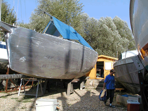C'est un cotre en aluminium de 11,50m, dériveur lesté, un tirant d'eau de 1,20m, quille relevée (c'est mieux pour approcher des côtes). Sinon le tirant d'eau est de 2,50 m. Ses deux safrans et son saumon (quille) nous permettent de nous poser tranquillement sur le sable. Comme c'est un cockpit central nous avons une très belle cabine arrière. Les magnifiques dauphins ont été peint par notre fille Laurence. Il nous aura fallu au moins deux ans et demi pour aménager tout le bateau, intérieur (isolation, peinture, meubles, vaigrage, électricité, électronique), extérieur (peinture, gréement, balcons, quille + dérive, etc...). en partant d'une coque pontée. Nous améliorons l'intérieur au fur et à mesure de nos escales. De notre séjour en France, nous avions ramené quelques tasseaux et les façades des placards. Ces derniers sont installés, dans le carré et la cabine avant. Il ne reste plus que le vaigrage. Pour celà nous attendons de trouver le tissus de nos rêves. Celà peut durer un certain temps. Si vous voulez avoir un aperçu de la finition. cliquez sur les flèches.