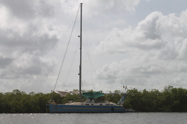 Ancre avant, ancre arrière, des amarres le retiennent aux palétuviers. Gwenalys est bien accroché.