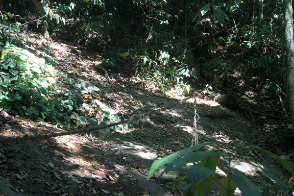 Après avoir franchi une rivière de rochers Il nous faut passer en terrain glissant. Heureusement ils ont prévu une corde !!!