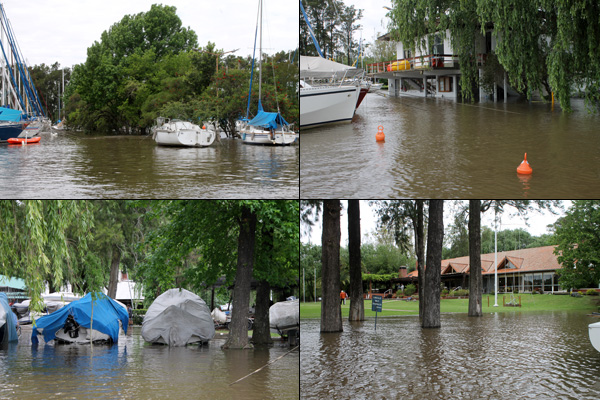 Normalement il y a une île devant les bateaux. Il ne reste que l'arbre; la bâtiment de l'école de voile; ces bateaux devraient être sur la pelouse; l'allée qui longe le plan d'eau est submergée.