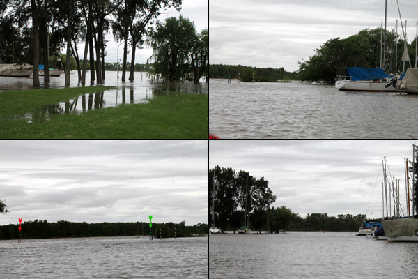 L'entrée de la marina; l'espace vert et les bancs sont engloutis; on ne voit plus que le sommet des deux feux d'entrée; le rio empiète sur la marina.