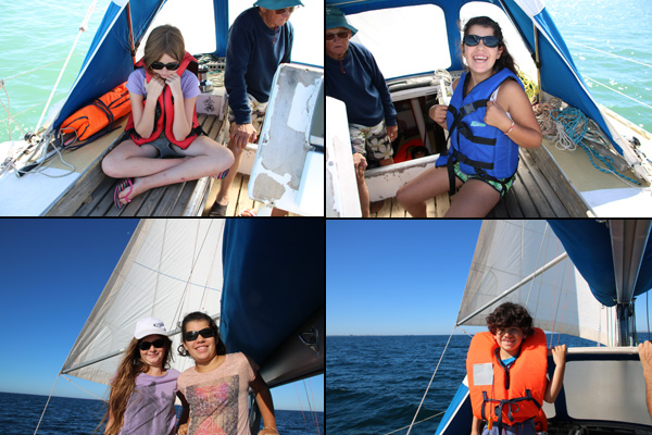 Concentration extrême pour Ninon. Il en faut pour rester assise en tailleur alors que nous sommes au près. Sara Maria se rit de tout même si ça penche. Par vent arrière c'est la détente. Gabriel tout sourire lui aussi.