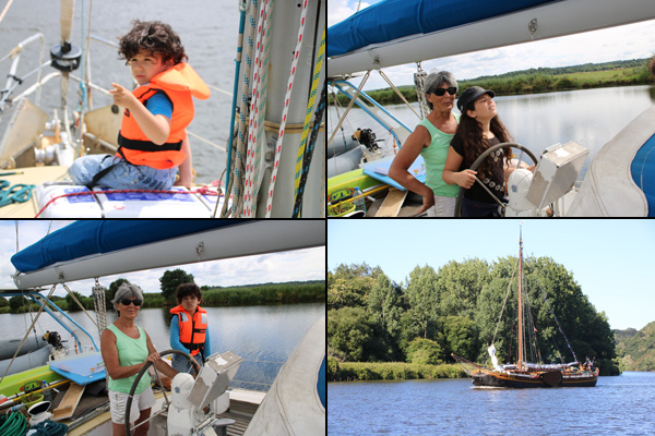 En nav., petits ou grands, aiment être à l'avant du bateau. Sara, toute fière à la barre, lève le nez pour voir par dessus la capote. Gabriel se contente de mettre la main sur la barre. On croise le vieux gréement.